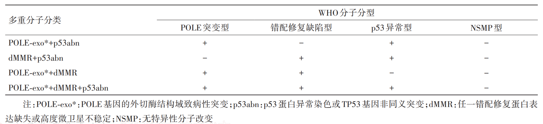 在TCGA分子分型方案中,POLE基因突變 、MSI/MLH1沉默以及TP53基因突變在 POLE超突變型和MSIH型中常存在交叉重疊。雖然大多數子宮內膜癌可以通過(guò)使用替代分子分型方案被明確地劃分為單一的分子亞型,但仍存在3.0%~11.4%的子宮內膜癌展現出一種以上的分子分型特征,被稱(chēng)為“多重分子特征”子宮內膜癌[2]。