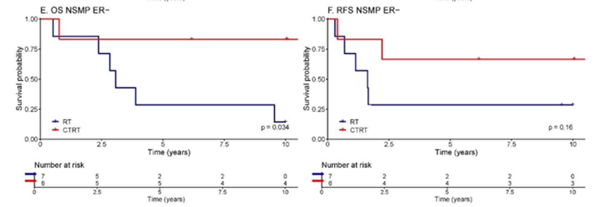 PORTEC-3 10年隨訪(fǎng)數據顯示:整體差異不顯著(zhù),但ER陰性亞組(約10%)預后差,可能從化療中獲益[12]。