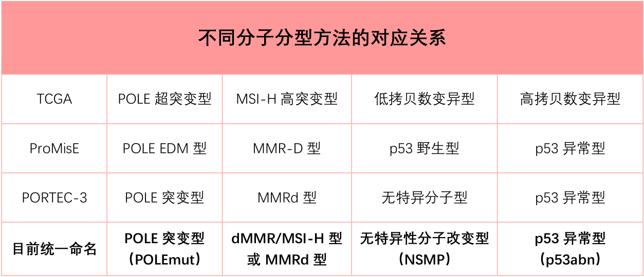 TCGA子宮內膜癌分子分型整合了基因組學(xué)、轉錄組學(xué)、蛋白組學(xué)、基因拷貝數和甲基化數據,將EC分為POLE超突變型(POLE ultramutated,POLEmut)、微衛星高度不穩定型(microsatellite instability-high,MSI-H)、低拷貝數型(copy number low,CNL)、高拷貝數型(copy number high,CNH)4種亞型。此后很多學(xué)者對EC分子分型進(jìn)行了方法學(xué)簡(jiǎn)化及流程優(yōu)化,提出了TransPORTEC和ProMisE分子分型策略,分子分型也逐步占據越來(lái)越重要的地位?,F如今分子分型已被國內外指南共識所推薦,FIGO 2023新版分期也納入了分子特征[1]。